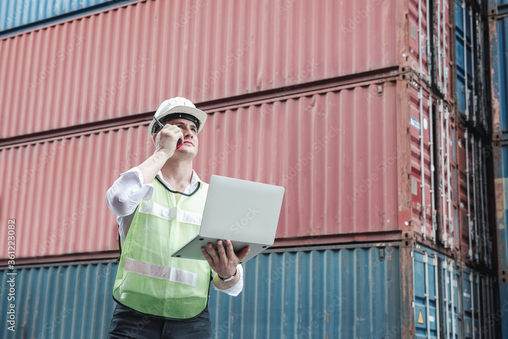 Container Logistics Shipping Management of Transportation Industry, Transport Engineer Managing Control Via Computer Laptop in Containers Shipyard. Business Cargo Ship Import/Export Factory Logistic.