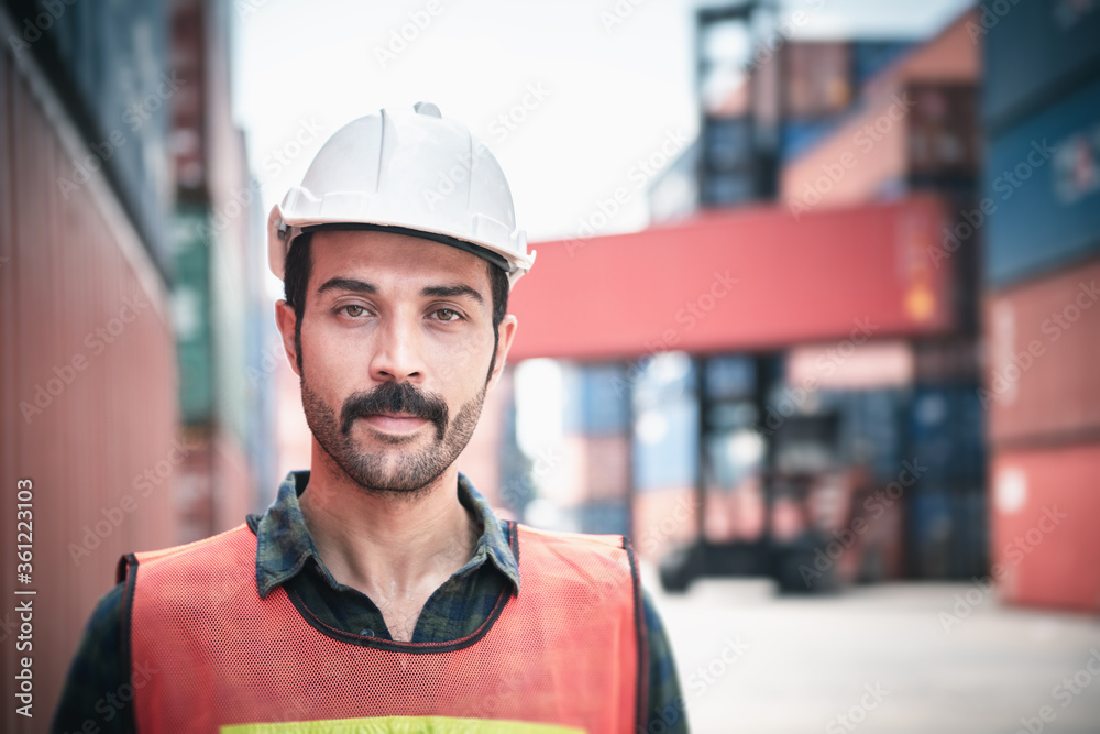 Portrait of Confident Transport Engineer Man in Safety Equipment Standing in Container Ship Yard. Transportation Engineering Management and Container Logistics Industry, Shipping Worker Occupation