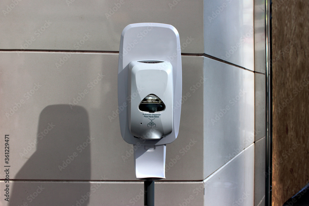 Hand sanitizer in a public place near the wall at the entrance to a grocery store. Hand sanitizer.