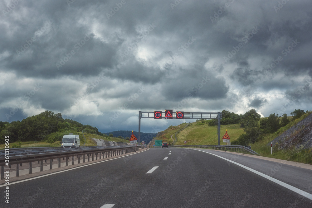 Picturesque highway in Croatia (autocesta A), the main automobile way with pointers and road signs. Scenic daytime landscape with fantastic clouds, shoot in motion