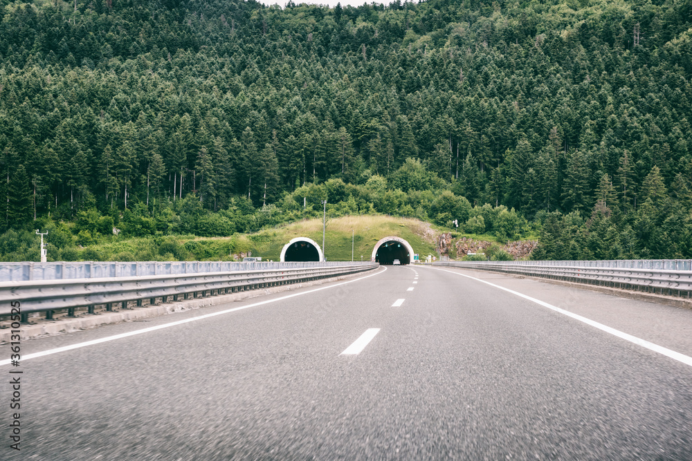 Picturesque highway in Croatia (autocesta A), the main automobile road with tunnel. Scenic daytime landscape, shoot in motion