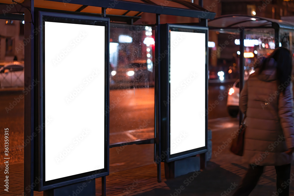 Advertising vertical billboard in the city glows at night. MOCKUP for design