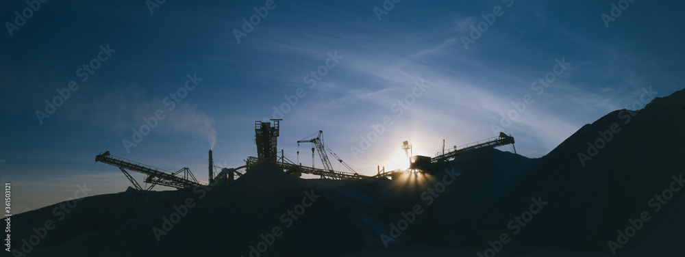Industrial landscape. Panorama constructions of mining and processing plant on the background of the evening sky in cold colors.