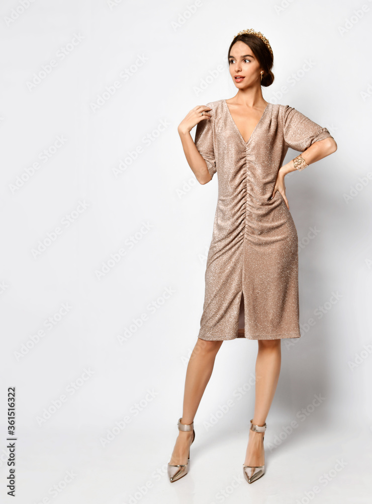 Young pretty lady in draped powder-pink sequined dress and tender diadem on hair looking pleasantly surprised. Full length portrait isolated on white
