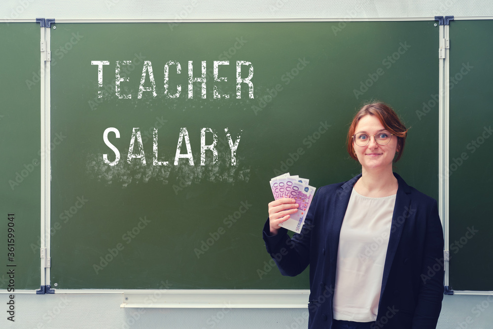 Woman teacher stands at the blackboard with money in euros and the inscription "Salary of the teacher", copy space for text. The concept of the cost of lessons at school and student learning