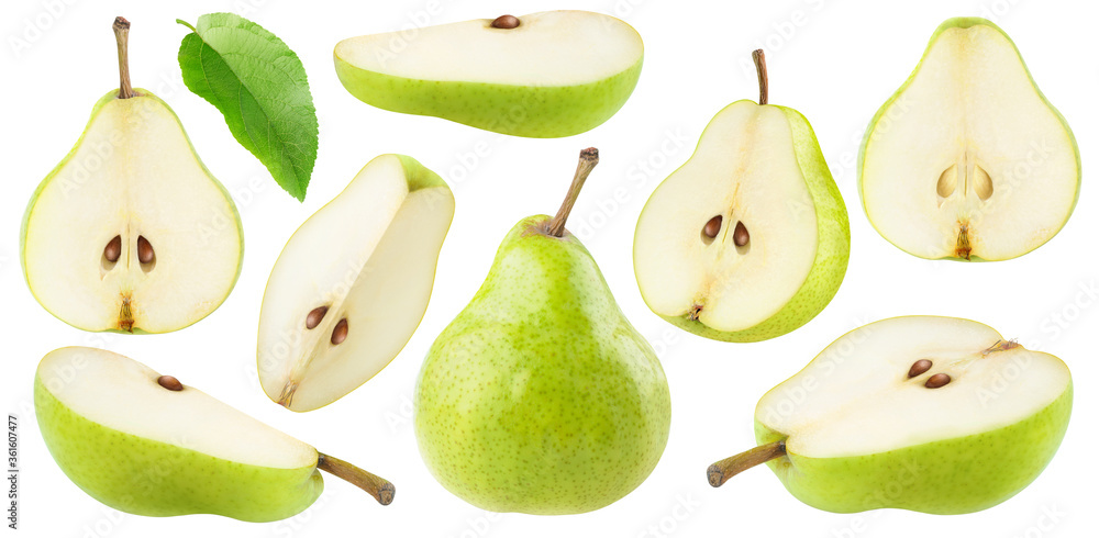 Isolated cut green pear fruits. Collection of green pear pieces of different shapes isolated on white background