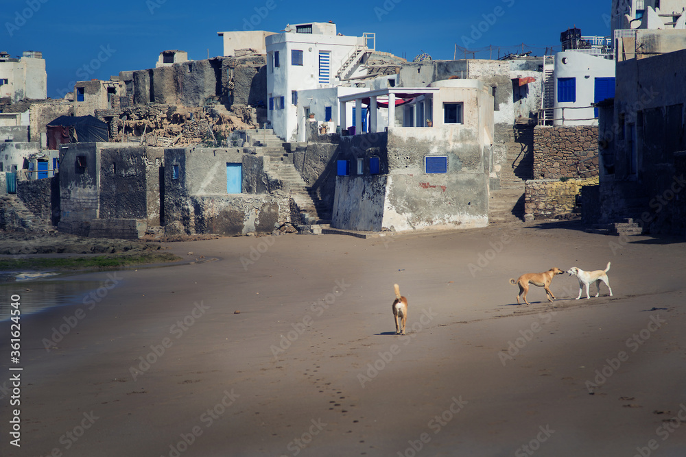 fishing town on the Atlantic ocean, white houses on the background