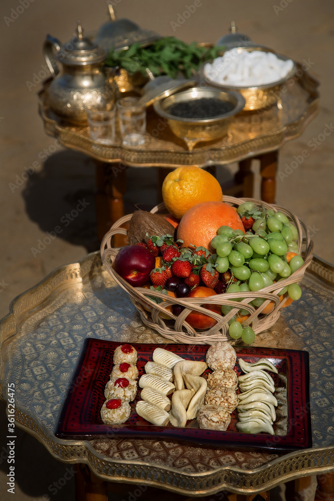 wedding ceremony on the ocean in Morocco, fruits and traditional sweets for treats