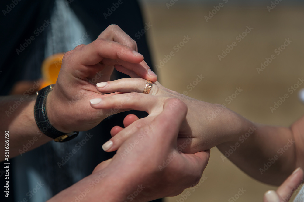 wedding ceremony on the ocean in Morocco, exchange of rings