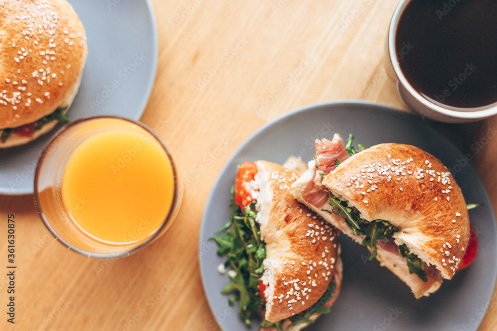 delicious and appetizing breakfast: a bagel stuffed on a plate