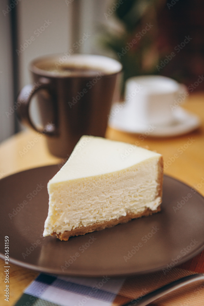 Piece of cake with coffee for breakfast on the table in a coffee shop