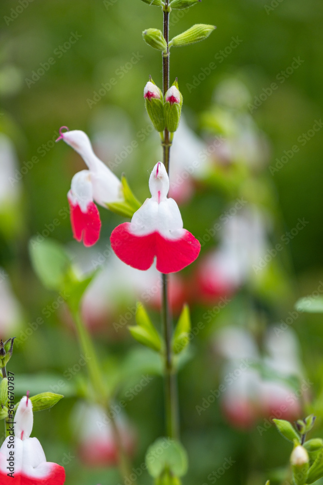 a pair of baby sage flower with pink and white colored petals blooming in the garden under the shade