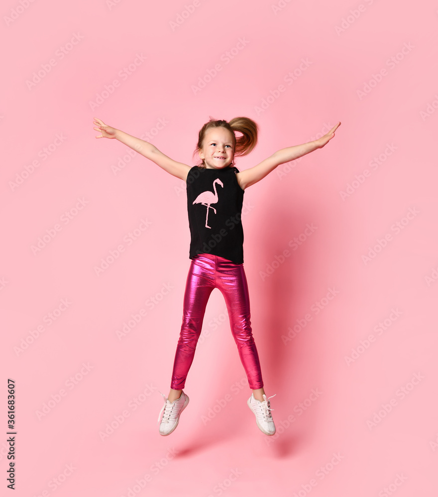 Adorable little girl in sleeveless t-shirt with flamingo and bright rose leggings is merrily jumping on place. Full length shot isolated on pink