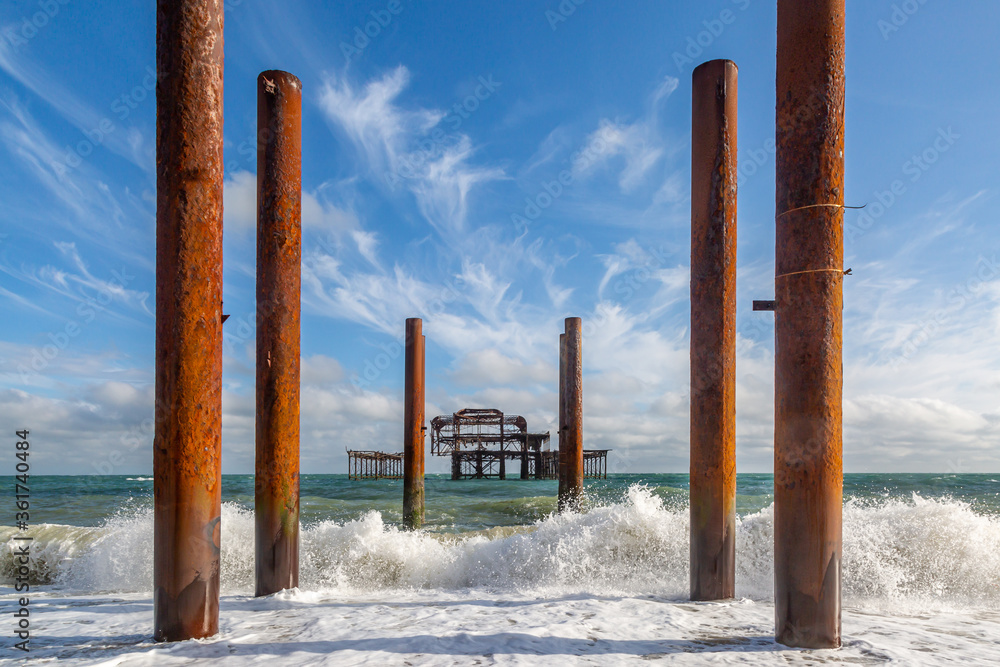 Waves crashing in front of the ruins of the West Pier in Brighton, with a blue sky overhead