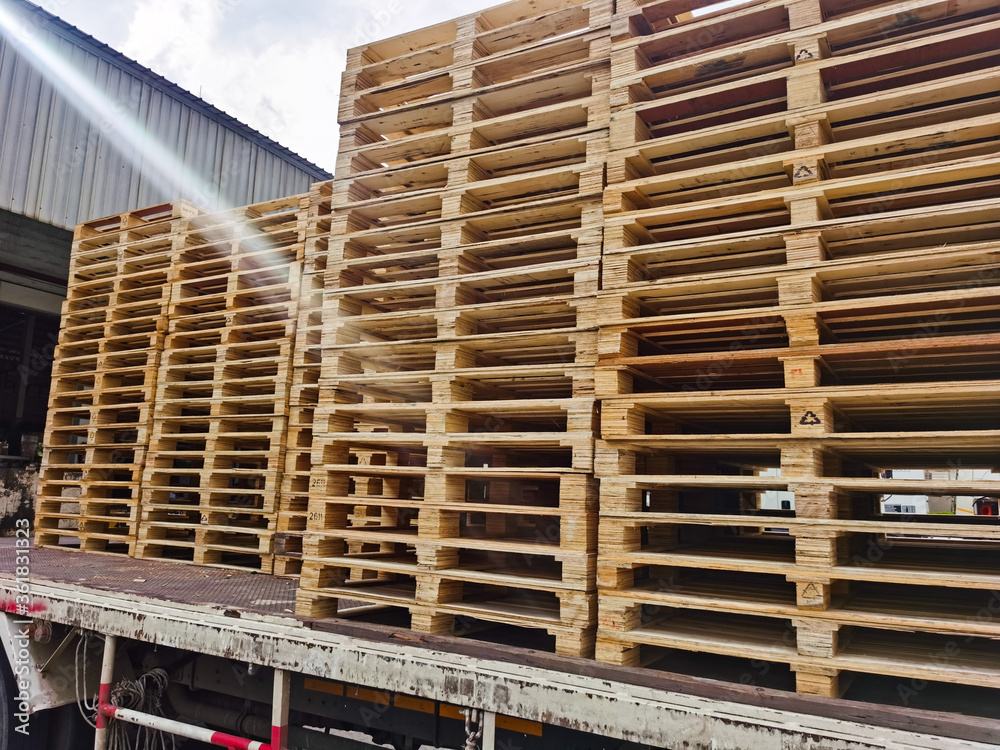 Worker driving forklift truck to unload wooden pallets stack from truck to the cargo warehouse to support shipment for logistics and transportation industry