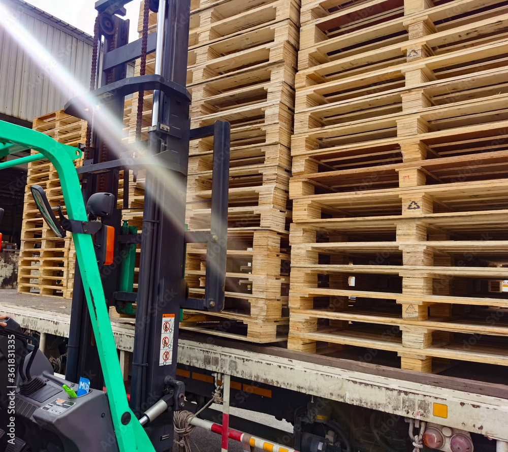 Worker driving forklift truck to unload wooden pallets stack from truck to the cargo warehouse to support shipment for logistics and transportation industry