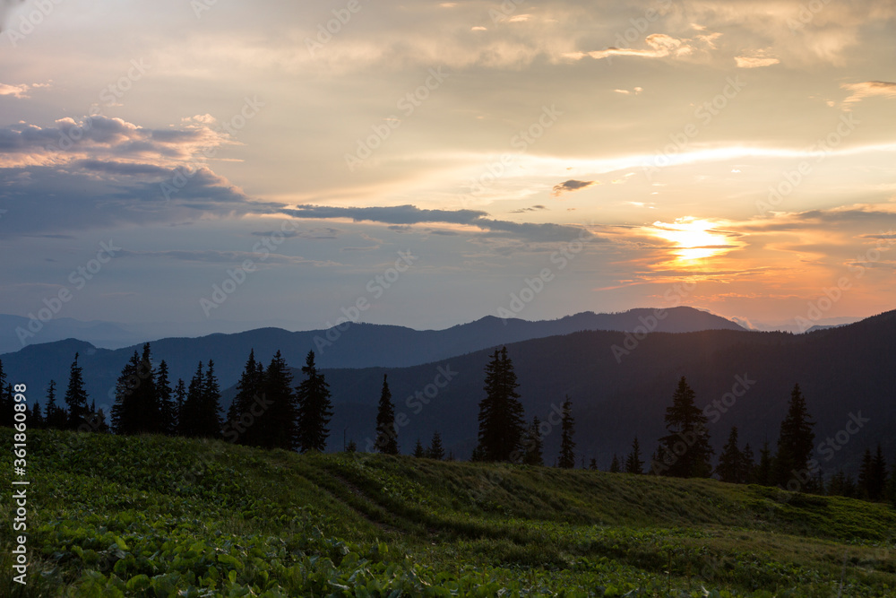 Sunset in the mountains. The evening rays break through the spruce trees. Carpathians, Marmaroshchyna, Maramures, Ukraine