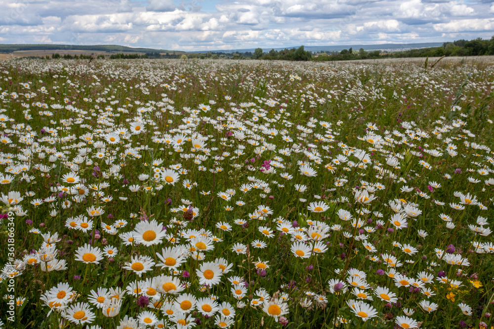 Summer sunny day in the meadow with blooming daisies.
