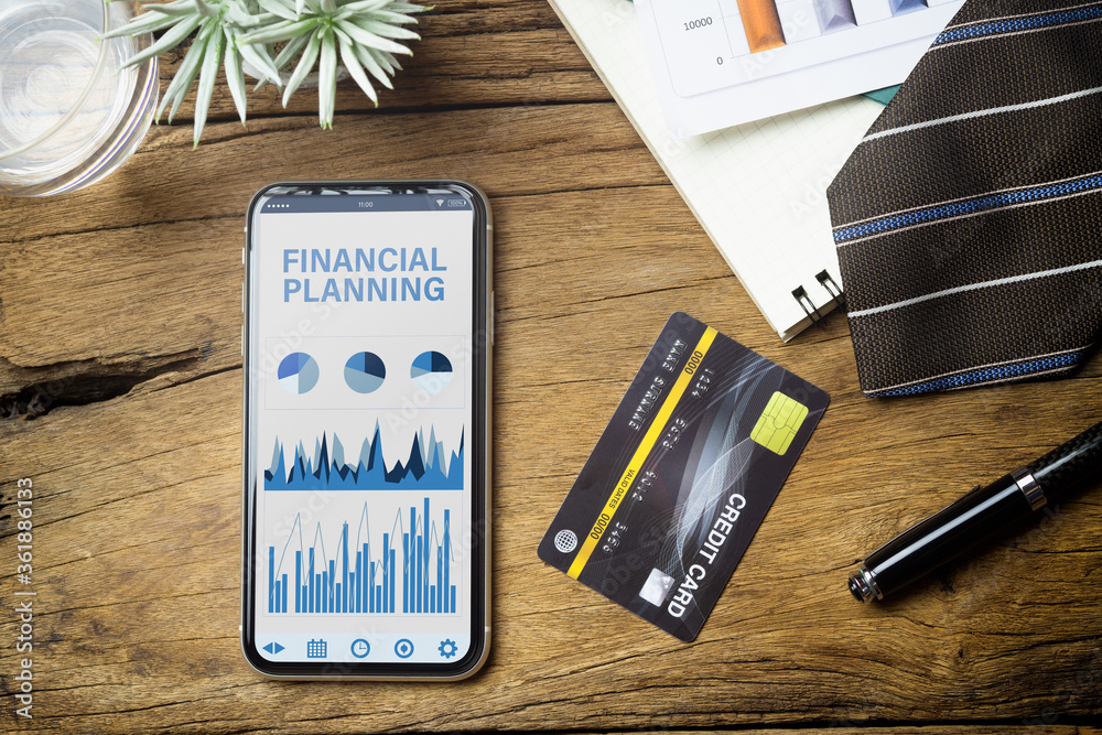 Financial Planning background Concept. Top view of Financial Planing application on smartphone with business reports graph chart, credit card, and businessman accessories on grunge wooden background.