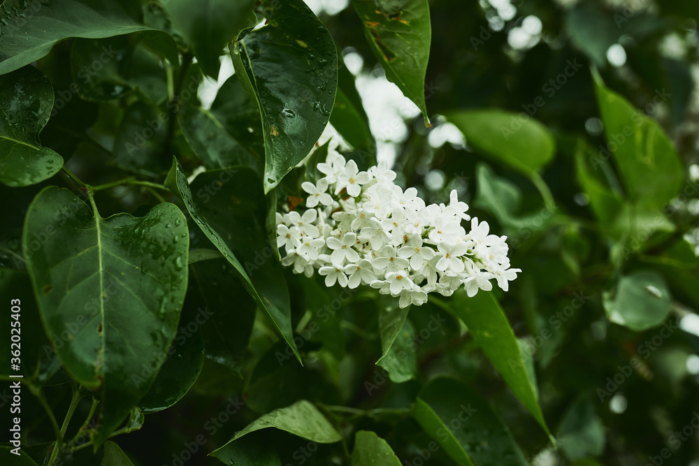 Branch of blooming white lilac in saturated fresh green leaves. Spring flowers.