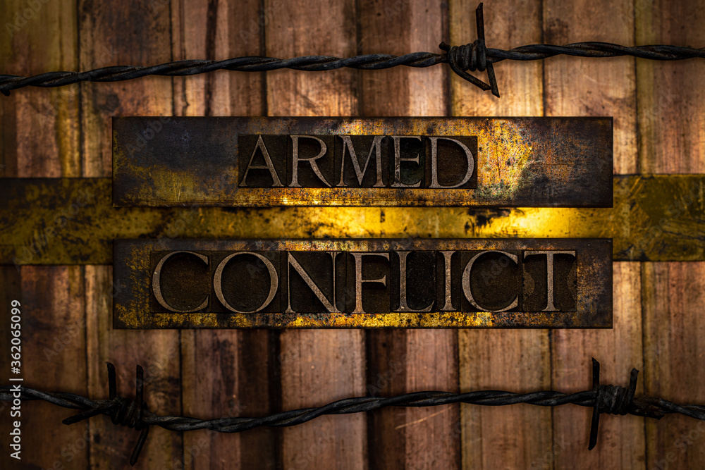 Armed Conflict text formed with real authentic typeset letters on vintage textured silver grunge copper and gold background with barb wire
