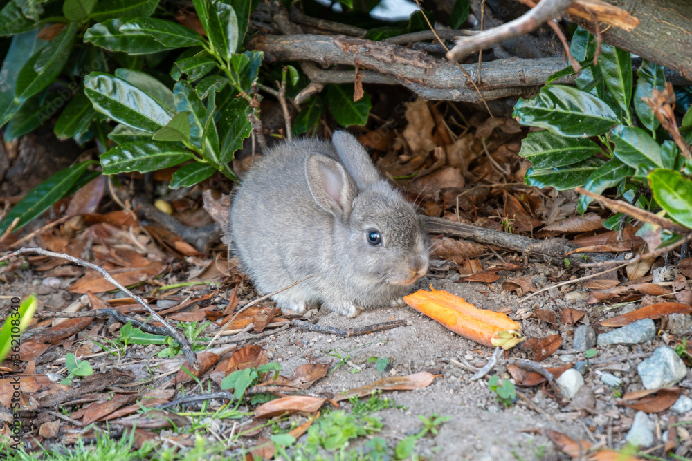 close up of one cute grey bunny eating a piece of carrot under the shade of bushes in the park