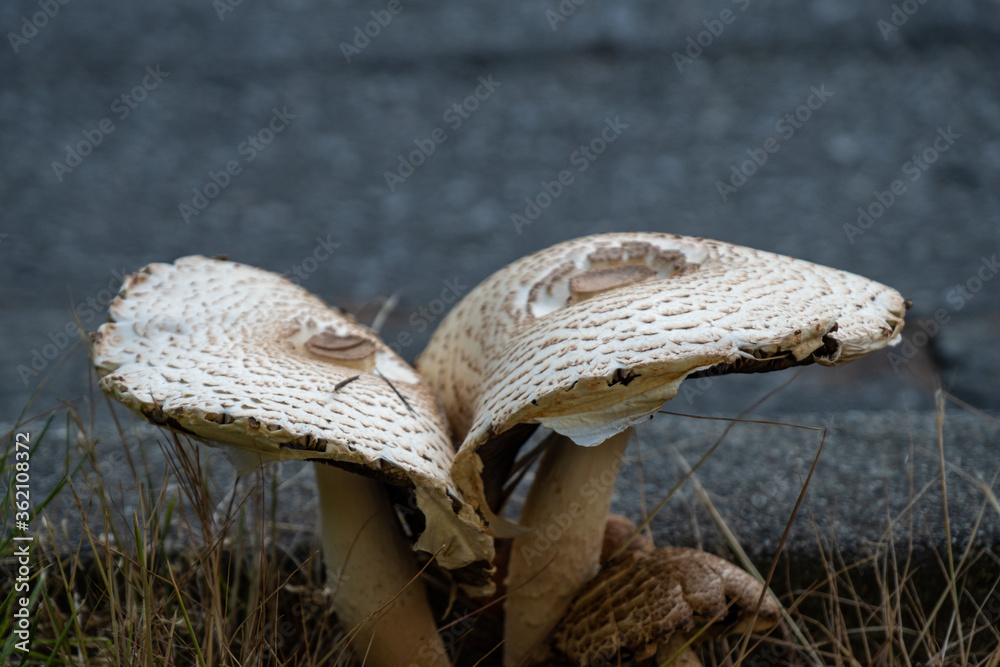 two big white mushrooms with big caps and brown texture grown on the roadside