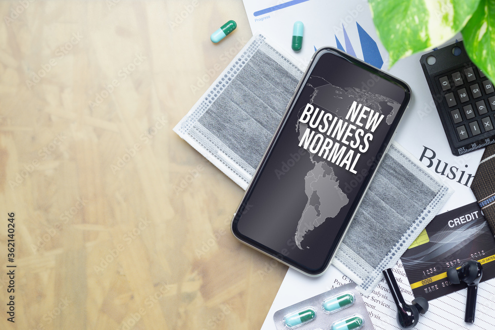 The Business New Normal After Covid-19 background concept. A smartphone with new business normal message with world map, medical face mask, medicine tablet on businessman working desk.