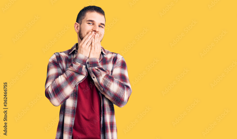 Young handsome man wearing casual shirt laughing and embarrassed giggle covering mouth with hands, gossip and scandal concept