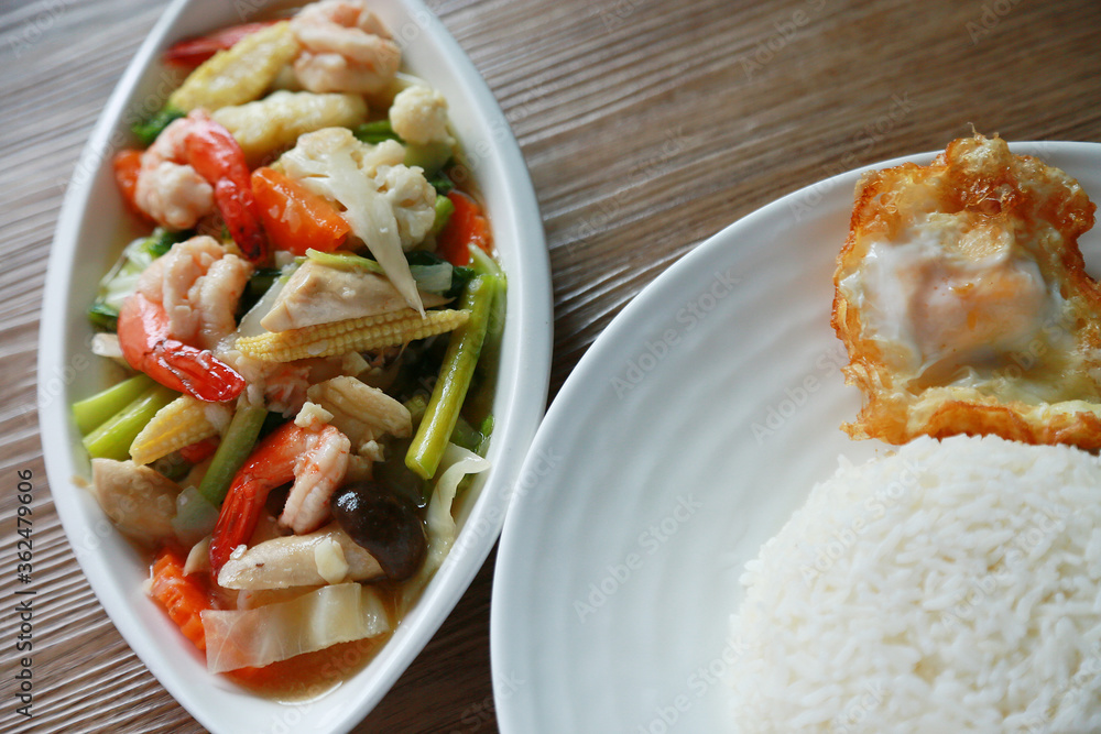 Stir fried mixed vegetable with shrimp in dish and serve with fresh rice in the restaurant. Healthy food in breakfast, launch and dinner.