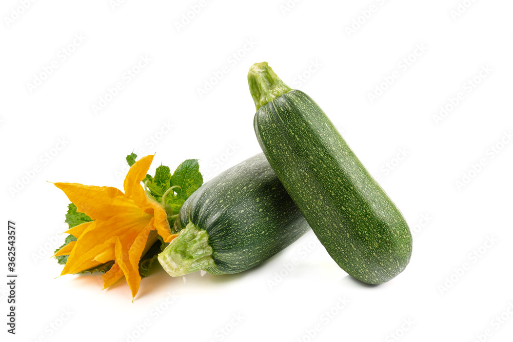 harvest of fresh courgettes with green leaves and flower, isolated on a white background