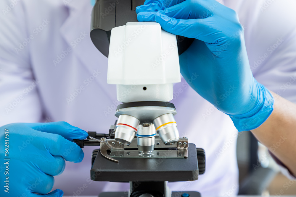 Close-up microscope with male researcher scientist medical doctor wearing coat gown using