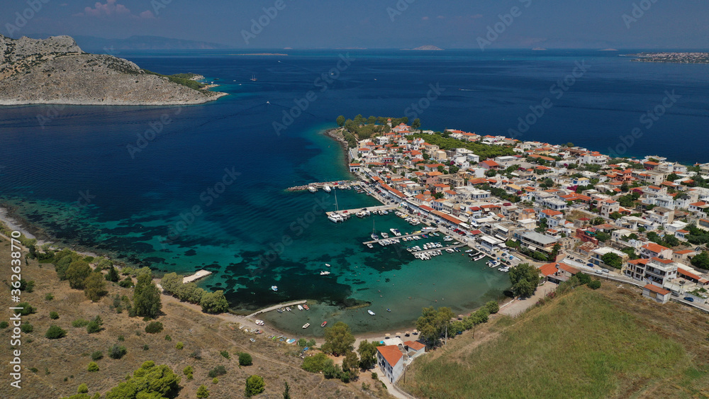 Aerial drone photo of picturesque fishing village of Perdika next to iconic small island of Moni, Aigina island, Saronic gulf, Greece