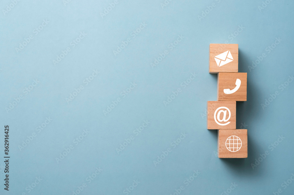 Sign of e-mail , address and telephone print screen on wooden block cube for business marketing contact website page.