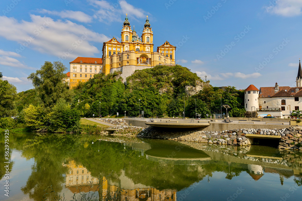 The scenic view of Melk abbey. Melk Abbey is a Benedictine abbey above the town of Melk, Lower Austria, Austria, on a rocky outcrop overlooking the Danube river.
