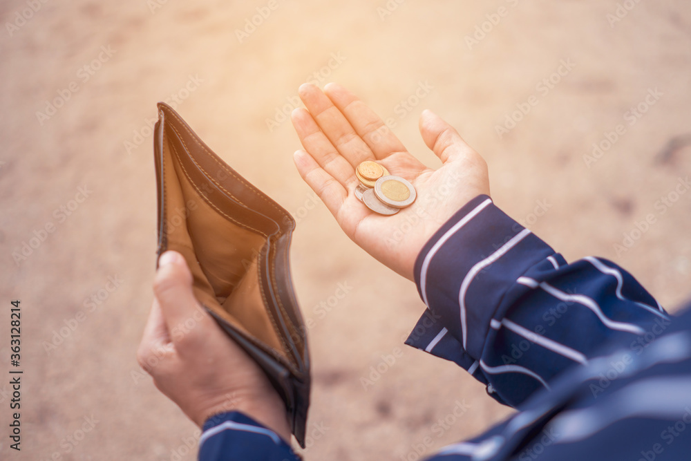 Woman holds an empty purse and coins in hand meaning money financial problem or bankrupt jobless, broke after credit card payday jobless.