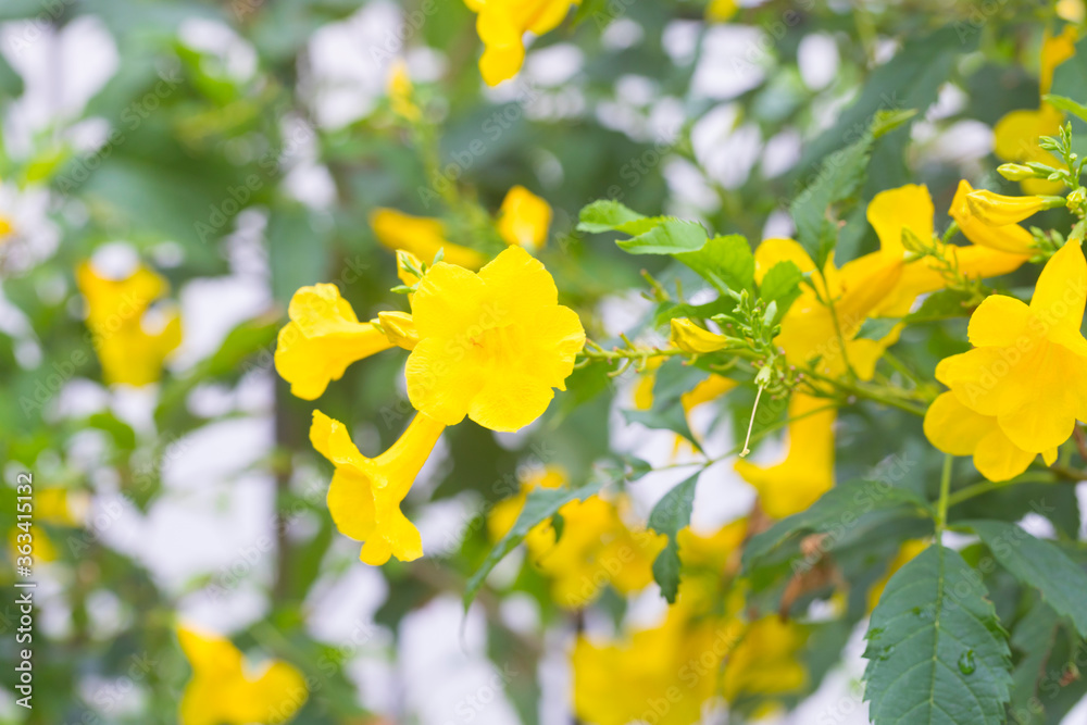 Yellow Elder, Gold Yellow color trumpet flower, Ellow Elder, Trumpet bush, Tecoma stans in nature garden.