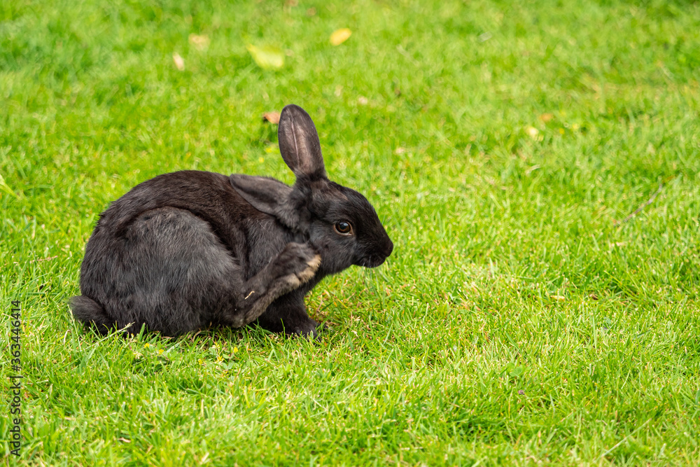 close up of a cute black rabbit sitting on green grass field scratching its face with its foot