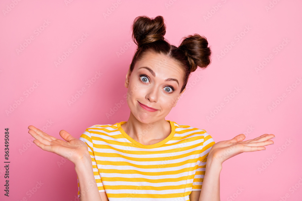 Close-up portrait of her she nice-looking attractive lovely pretty charming cute ignorant cheery girl shrugging shoulders don't know isolated over pink pastel color background