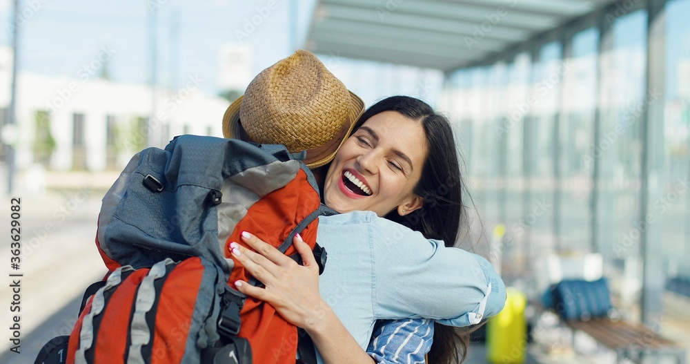 Beautiful Caucasian young brunette woman smiling and meeting boyfriend or husband outdoor at bus stop. Coming back home from trip. Couple in love meet Rear of guy traveller hugging girlfriend Close up