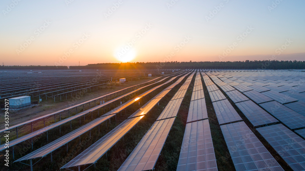 Photovoltaic solar panels at sunrise and sunset.