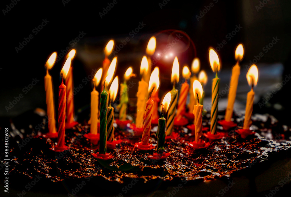 Homemade chocolate birthday cake with lit candles ready for celebration, outdoor setting, natural light, festive atmosphere, sweet dessert for birthday song moment, perfect for joyful party scenes