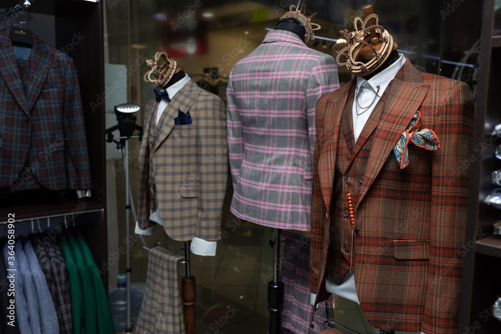 Beautiful male stylish expensive suits with bow tie on a mannequin. mannequins in the wind of a men's clothing store