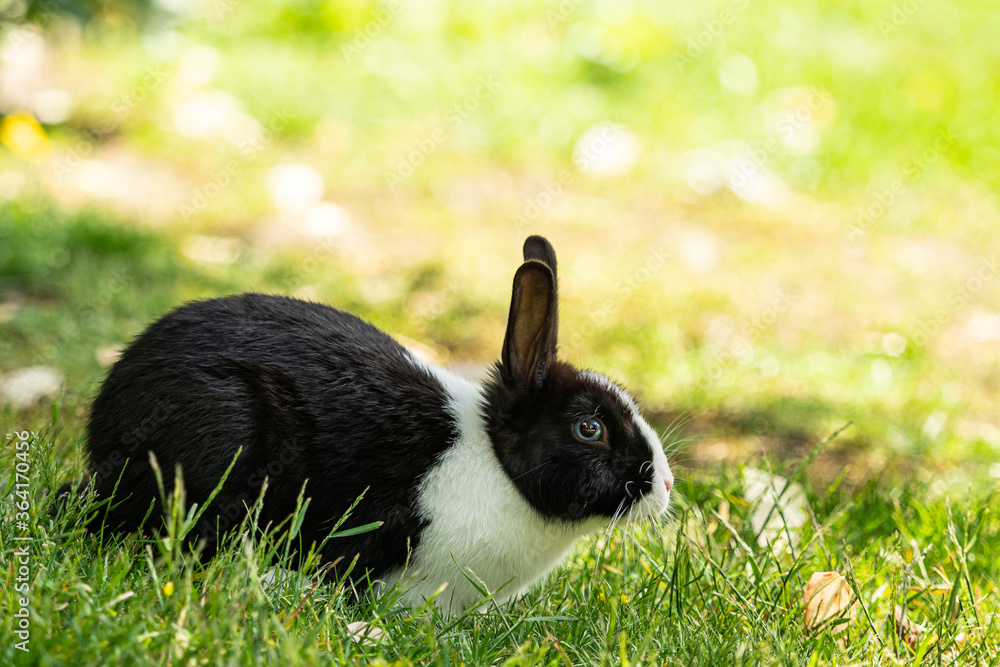 close up of an adorable black bunny with white fur on the chest and forehead eating on green grass field