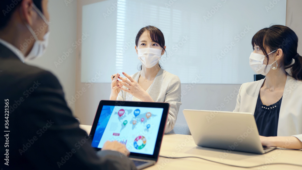 マスクをつけてミーティングする人々 感染対策 新しい生活様式