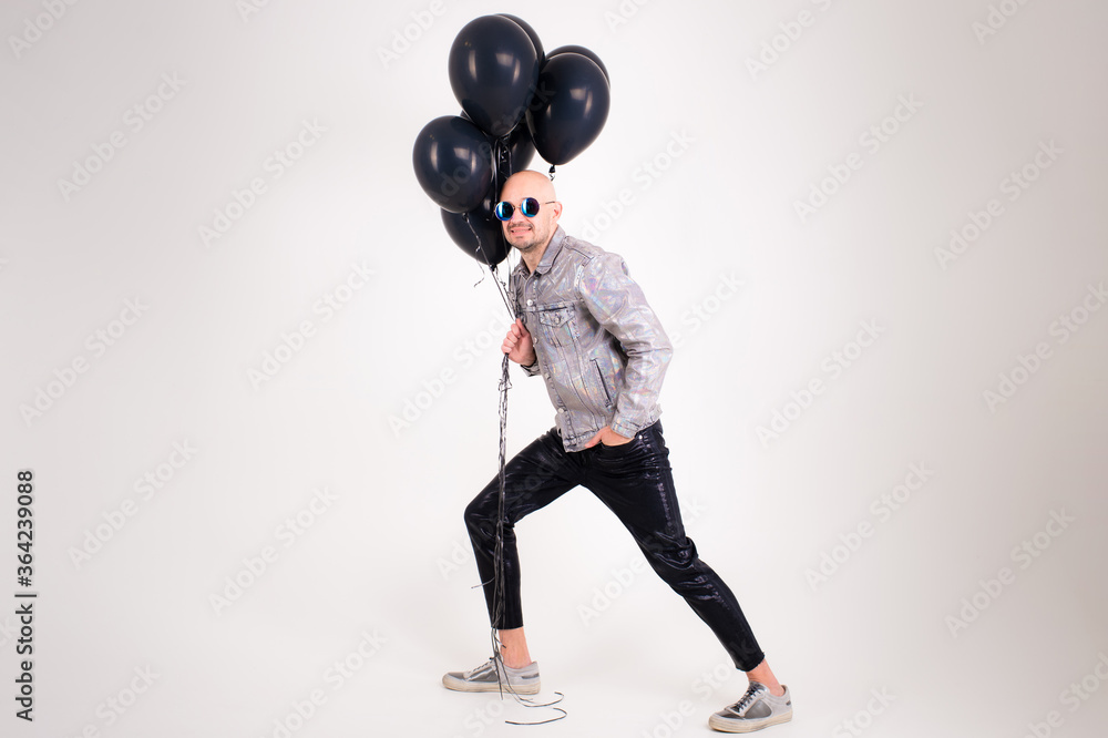 Beautiful caucasian man without hair in grey shirt, black leather trousers and grey trainers with black sunglasses and black baloons have a lot of fun isolated on white background