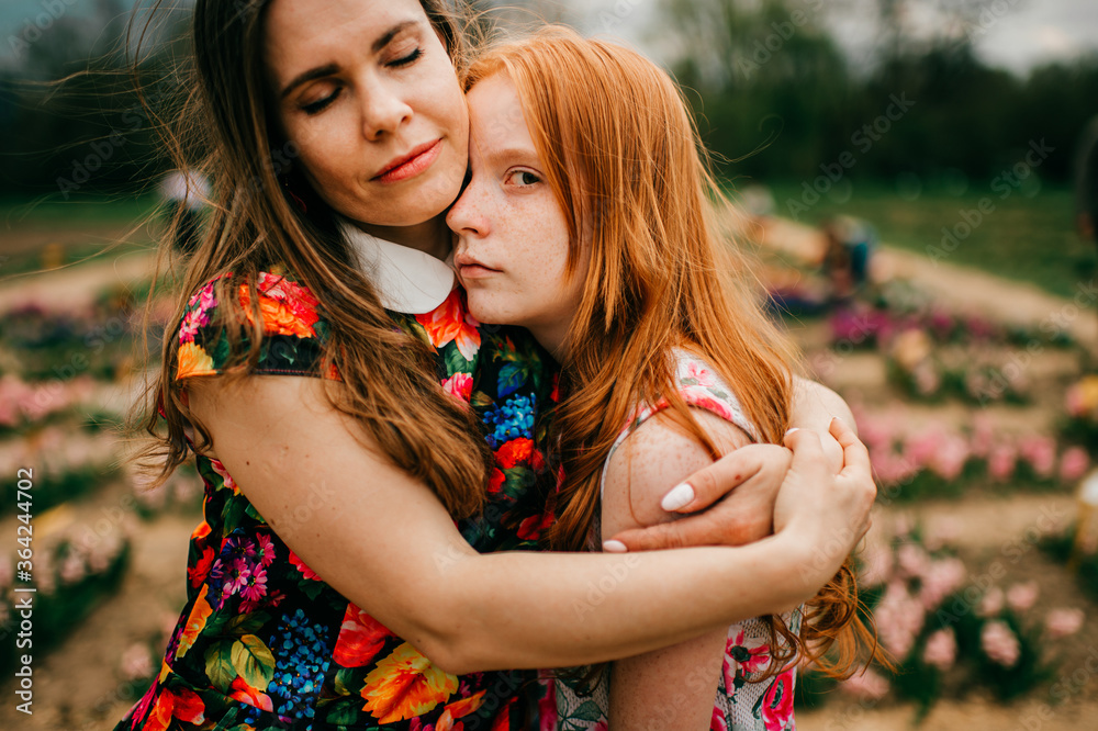 Attractive child with long red hair in pink dress rejoices with her pretty tall sister with dark hair in black dress hug and love each other