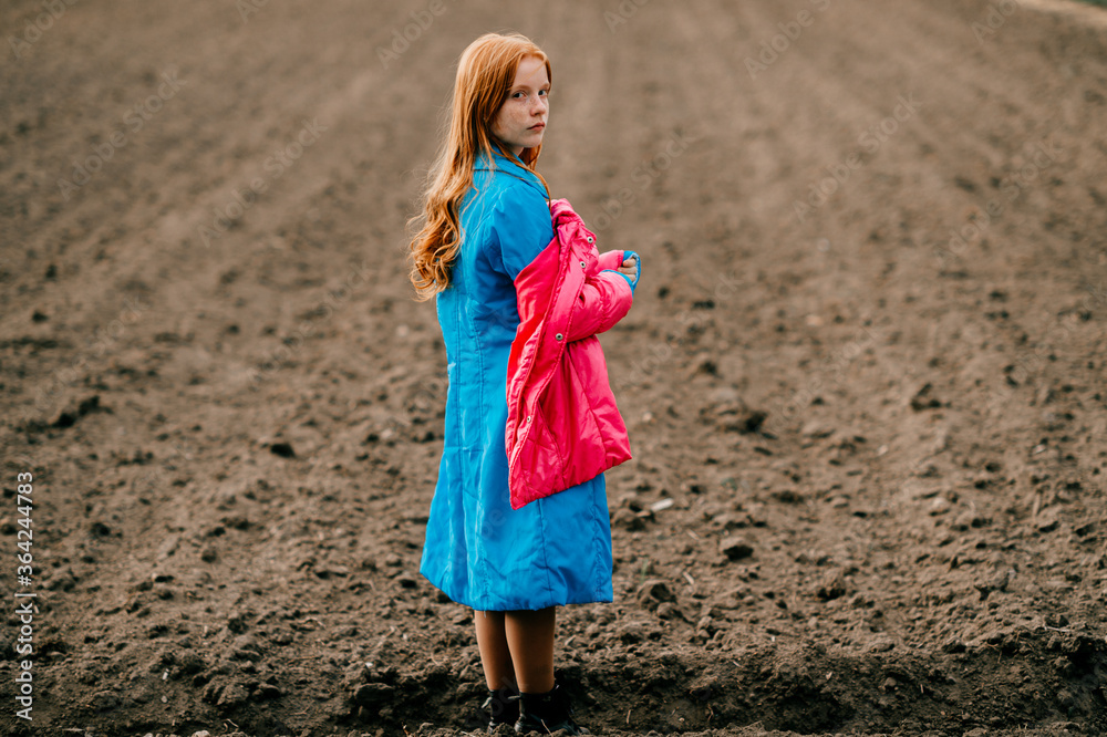 Beautiful strange red head girl in long blue coat and pink warm jacket spends a lot of time on the big empty field.