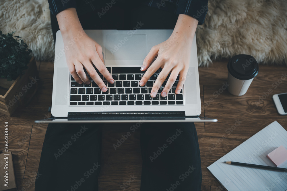 Work From Home Lifestyle and Business Online, Attractive Woman Hands is Typing on Keyboard Laptop While Working at Home. Business Freelance Person Using Computer Laptop at Her Home Workplace