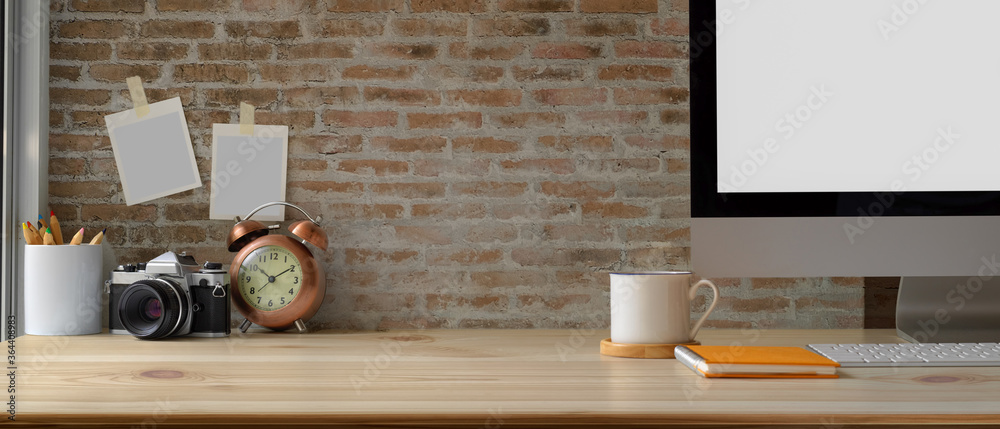 Modern home office with mock-up computer, camera, stationery, decorations and copy space